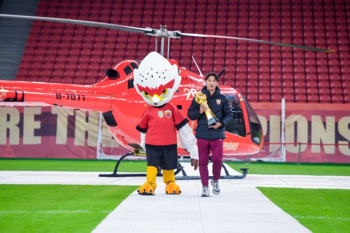 得意东说念主心的夺冠视频事后,巨匠的倡导被静候在内场的临港捷运精致版直升机诱骗,典礼开动前,这架直升机载着王燊超和奖杯从川沙飞抵球场。这一步调不仅是荣耀的展示,更是俱乐部积极探索“低空+足球”体旅和会新范式的活泼推行。随后,王燊超与俱乐部总司理沙良昌共同将新赛季冠军奖杯安放于柱顶,与三座历届火神杯构成“冠军奖杯矩阵”,将现场氛围推向昂扬。
