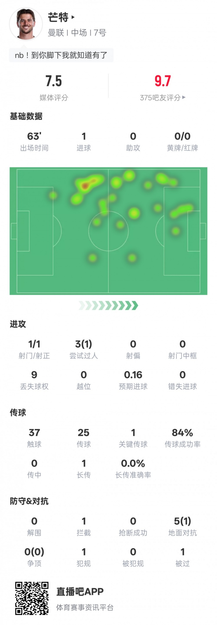 芒特本场比赛数据:1进球1过东说念主顺利1流弊传球,评分7.5
