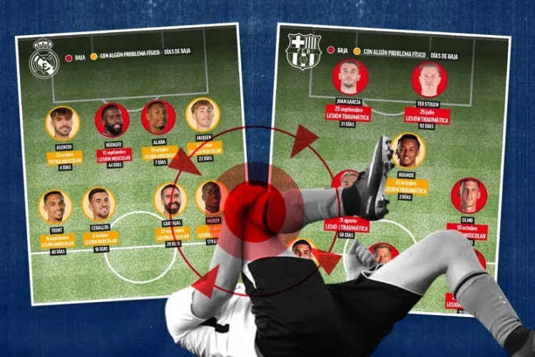 10月25日讯 据《马卡报》统计,皇马和巴萨两队计较有多达16名球员受到不同经由的躯壳问题困扰。其中,皇马的吕迪格和阿拉巴,以及巴萨的特尔施特根、加维、莱万、奥尔莫、拉菲尼亚和霍安-加西亚共八东谈主已详情缺席。