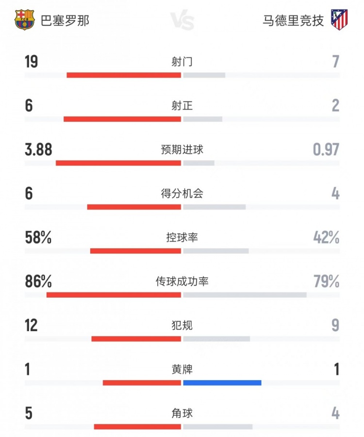 巴萨vs马竞全场数据:射门19比7、射正6比2、控球率58%比42%