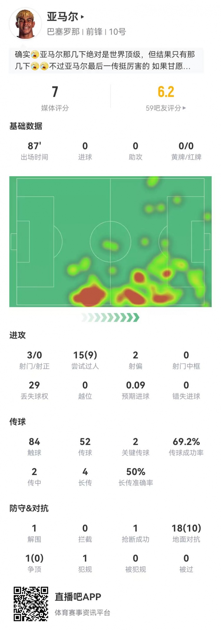 亚马尔本场3射0正 2关键传球+29丢失球权 15过东谈主9凯旋 获评7分