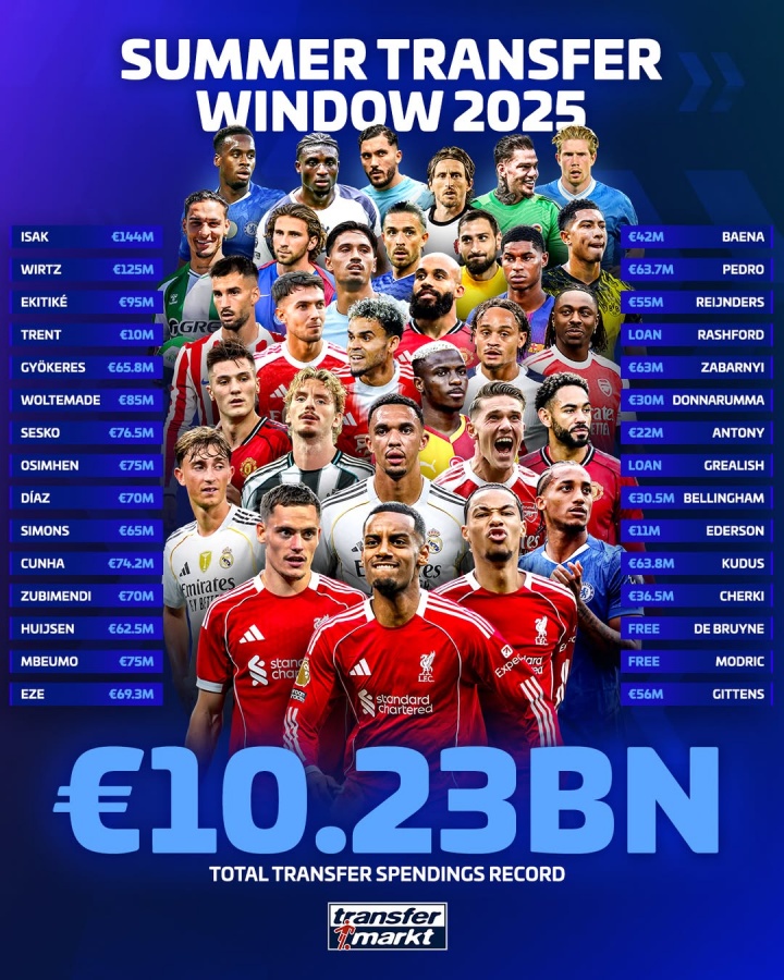 德转发布海报,该机构统计暗示,足坛今夏转会窗的总开销达到惊东说念主的102.3亿欧。