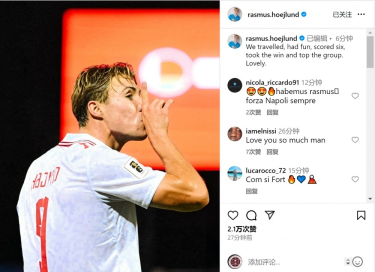 霍伊伦社媒晒出比赛像片,庆祝球队取胜,配文:“咱们远征客场,享受比赛,轰入6球,拿下告捷并领跑小组!太私密了。”