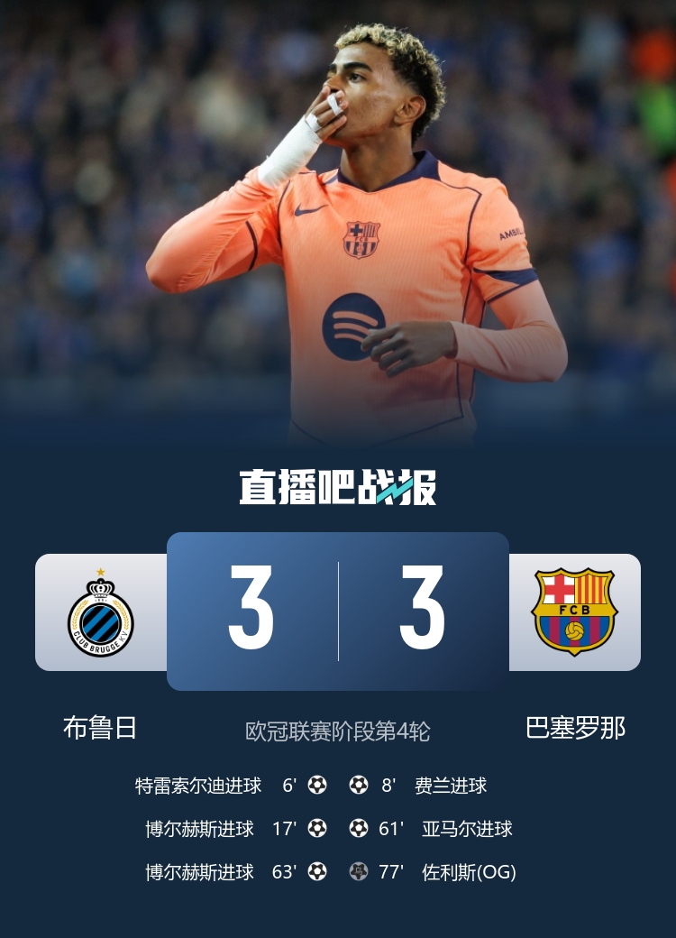 亚马尔破门+造乌龙,费兰立功,巴萨3-3布鲁日,无缘连胜。