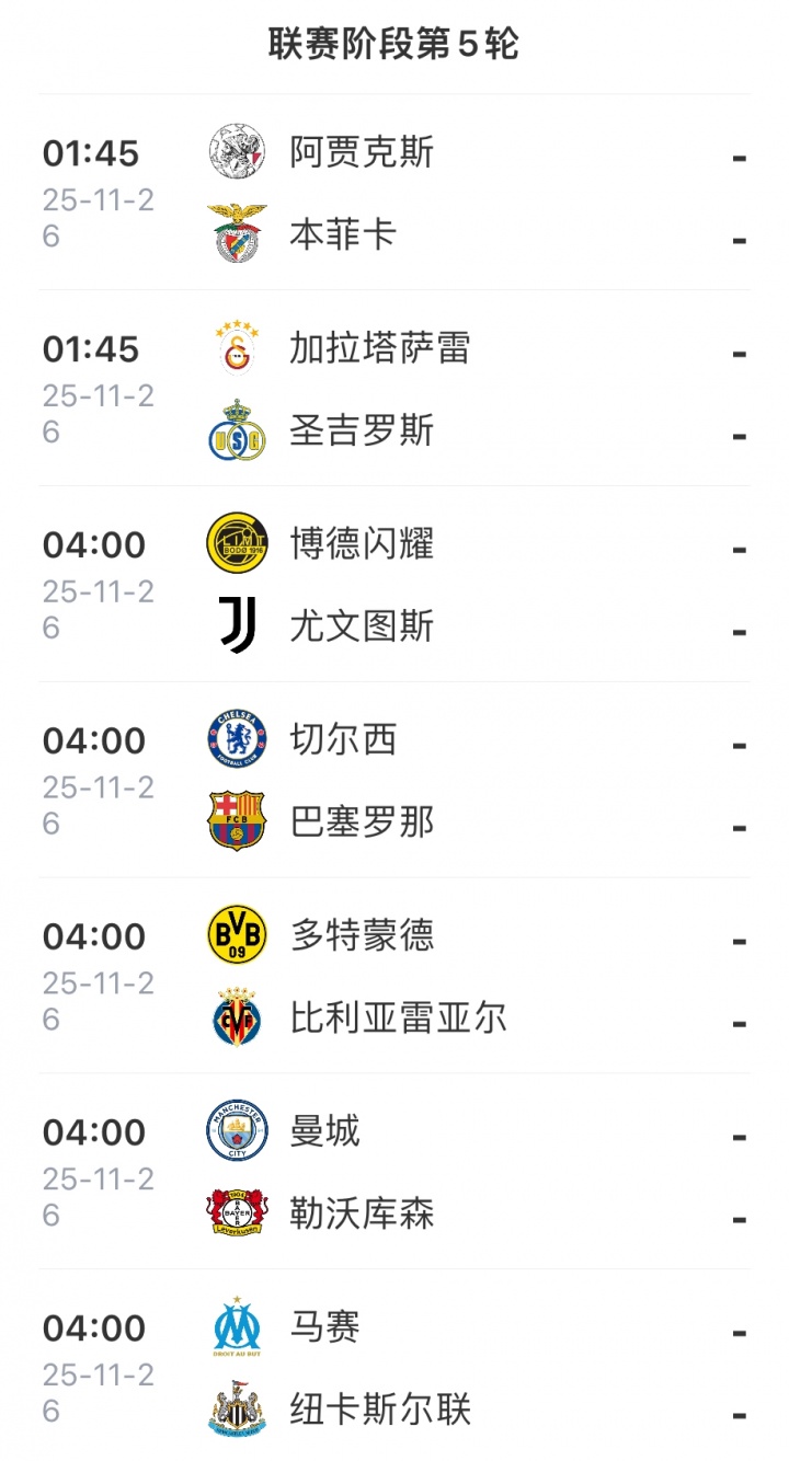 欧冠联赛阶段第4轮战罢,英超6支参赛队得到5胜1平的战绩。