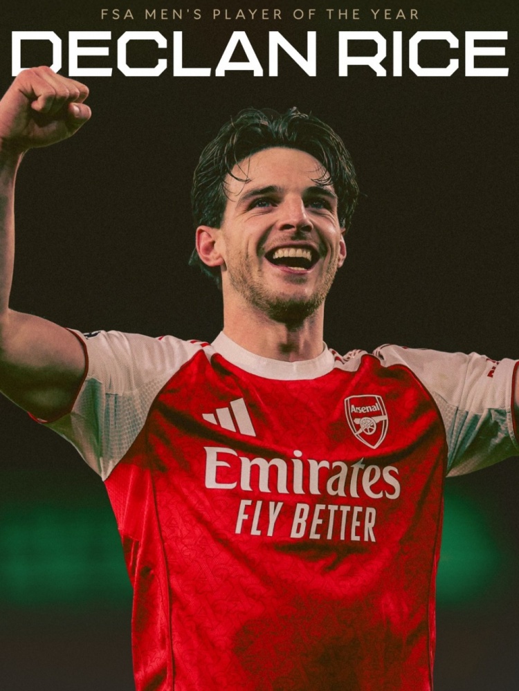 赖斯获颁英格兰和威尔士球迷组织FSA年度最好男足球员奖,阿森纳官方社媒晒出海报,配文:“进程全英国球迷的投票,赖斯当选FSA年度最好男足球员,实至名归。”