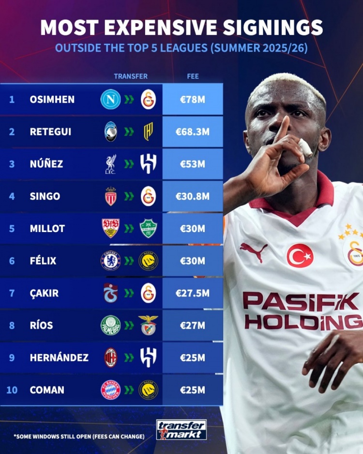 非五大联赛球队今夏最贵引援榜:奥斯梅恩、雷特吉、努涅斯前三