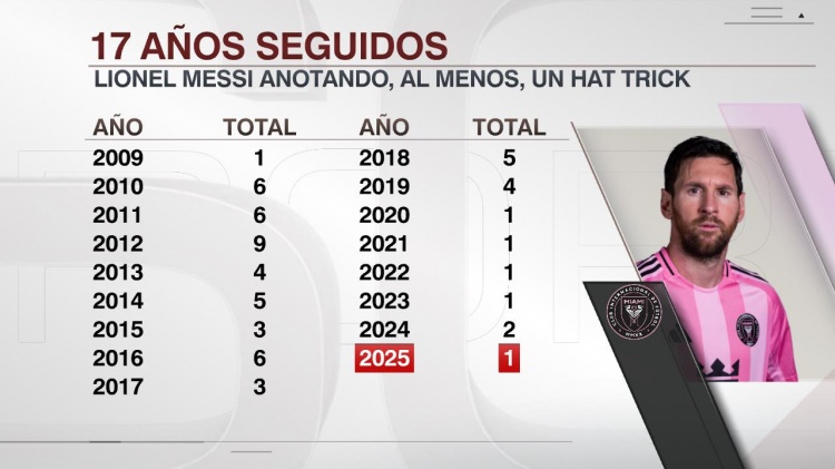 据ESPN统计,这是梅西本年的首个帽子戏法,他运动17年在比赛中戴帽。