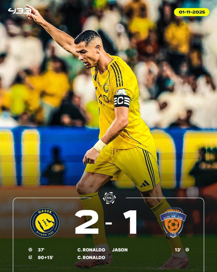 11月1日晚上的沙特联第7轮,利雅得见效主场2-1逆转费哈,C罗双响+第104分钟点射绝杀。