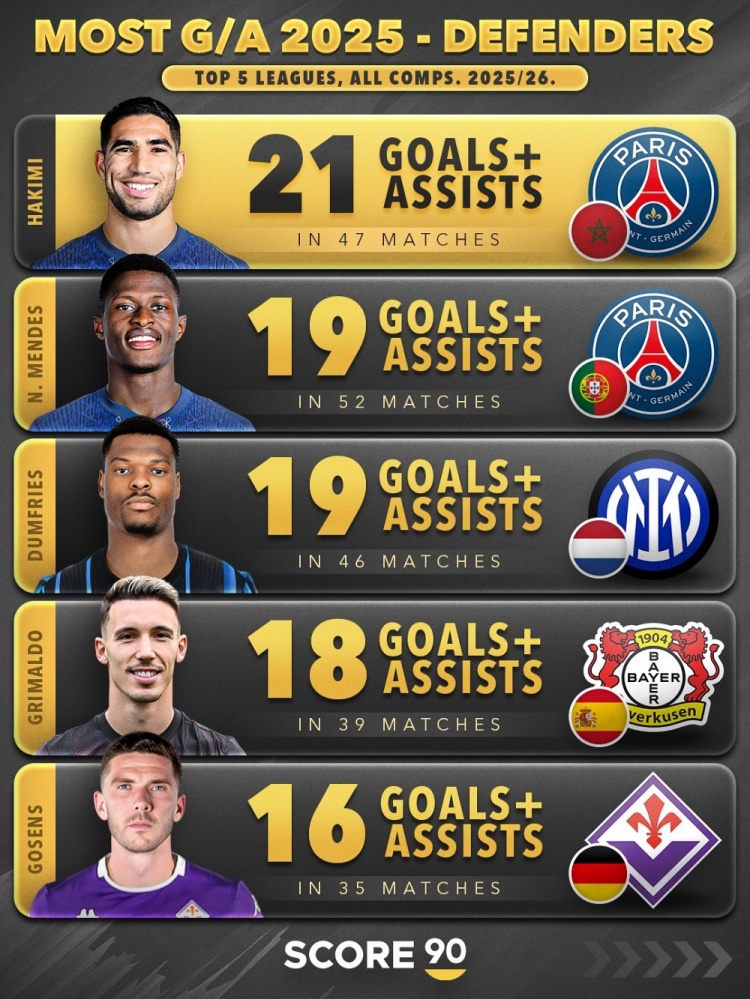 11月10日讯 Score90统计了2025年五大联赛后卫在俱乐部+国度队比赛中参与进球的数目,并排出榜单。