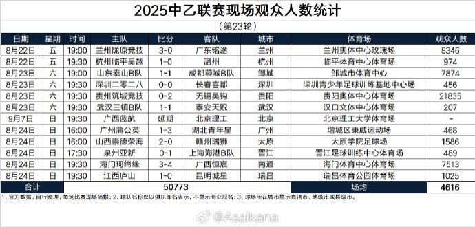 > 2025中乙联赛现场不雅世东谈主数统计(第23轮)(1场延期)