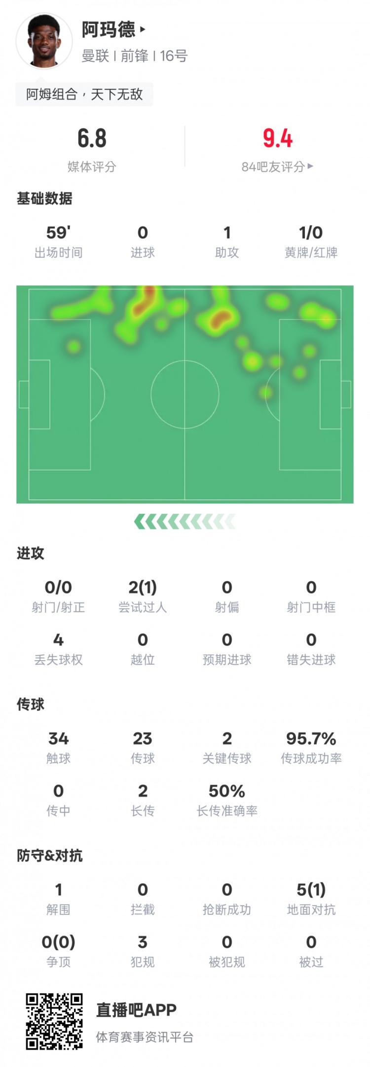 阿玛德本场数据:1助攻2关节传球1过东谈主生效,评分6.8
