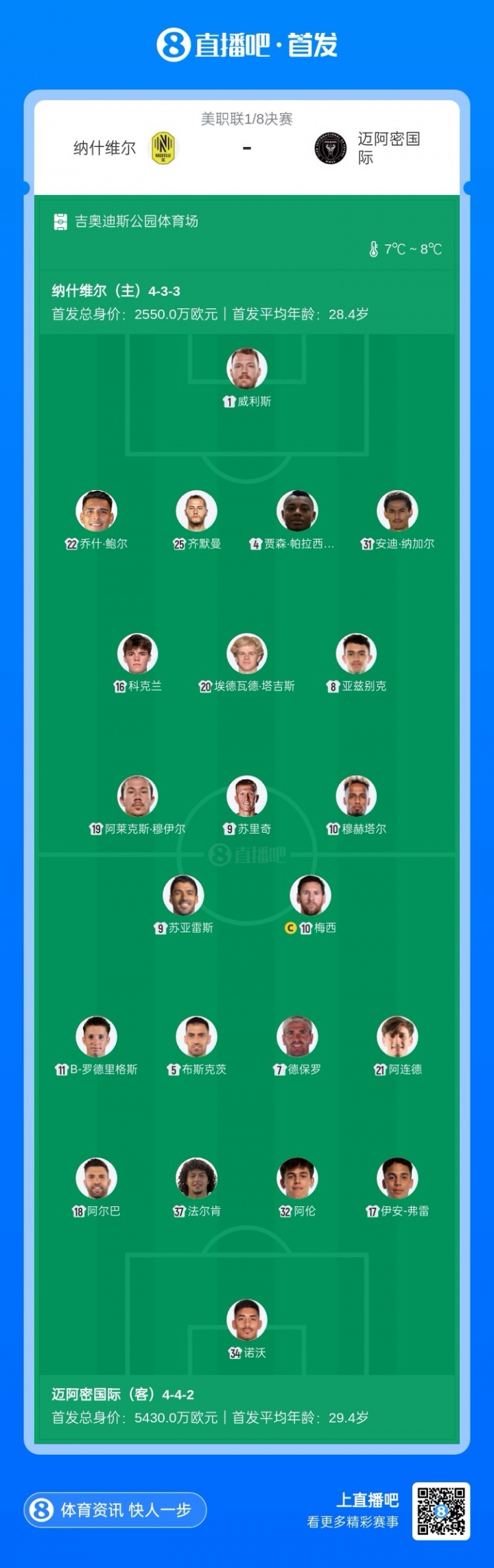 11月02日讯 好意思职联1/8决赛,迈阿密海外客战纳什维尔,赛前两边首发公布。