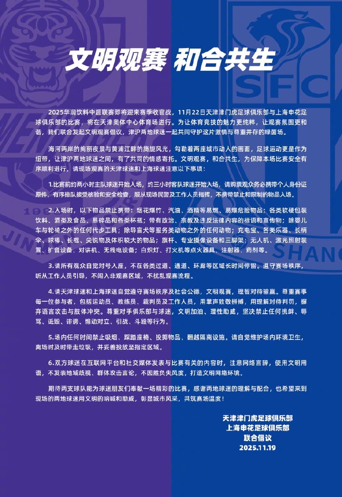 2025华润饮料中超联赛行将迎来赛季收官战,11月22日天津津门虎足球俱乐部与上海申花足球俱乐部的比赛,将在天津奥体中心通顺场进行。为让体育竞技的魔力更地谈,让不雅赛氛围更融合,咱们连合髻起漂后不雅赛倡议,津沪两地球迷扫数共同看护这片情怀与尊重并存的绿茵场。